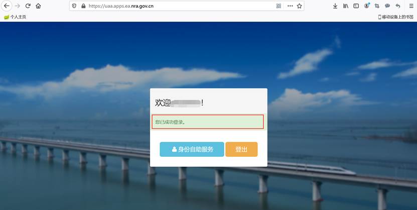 3.成功登录后显示“欢迎,您已成功登录”,只有“身份自助服务”和“登出”两个选项